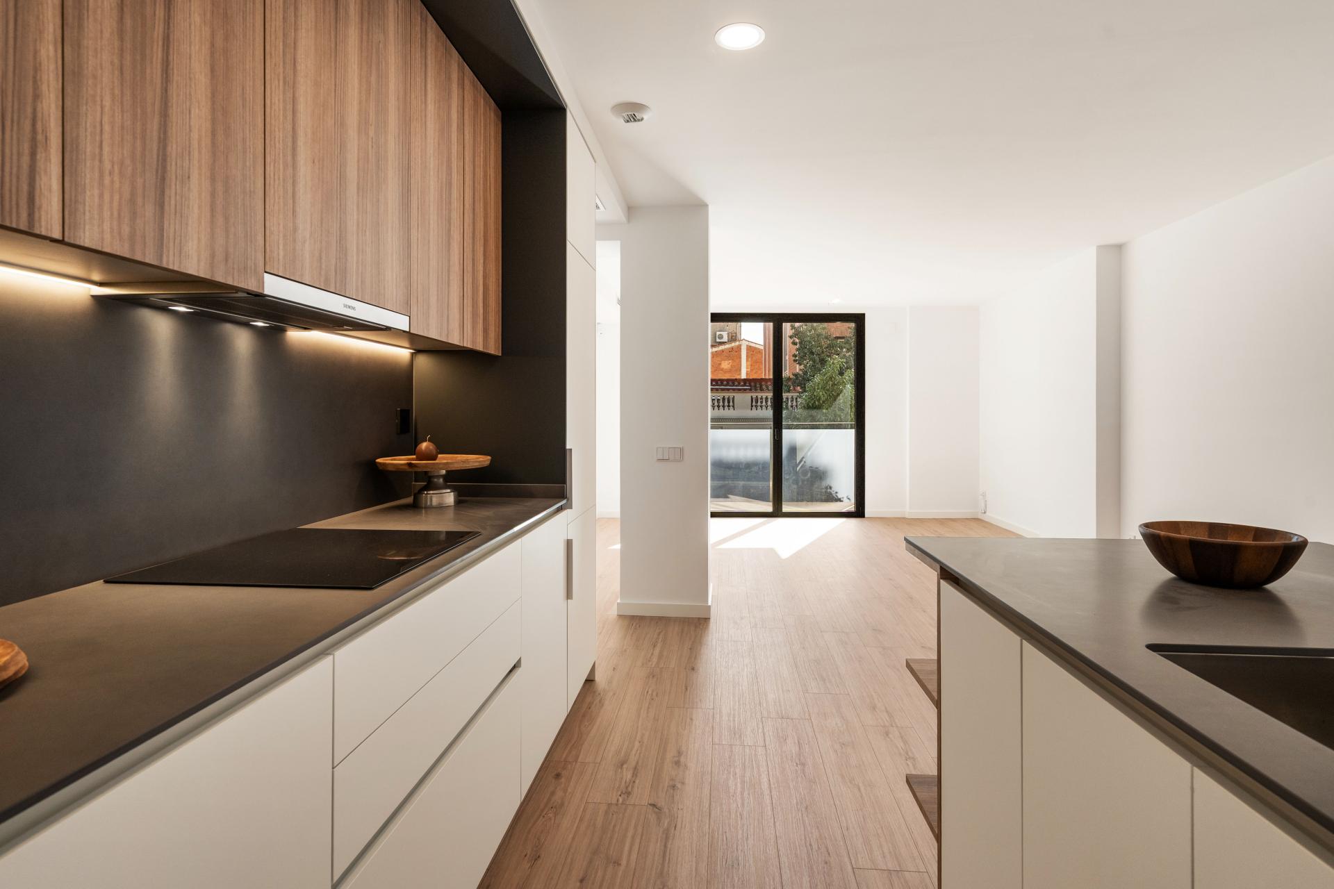 La cocina de diseño, integrada en el comedor, cuenta con una cuidada península con zona de taburetes y está equipada con electrodomésticos Siemens de alta gama, combinando estética y funcionalidad. Un práctico armario-lavadero completa esta zona.